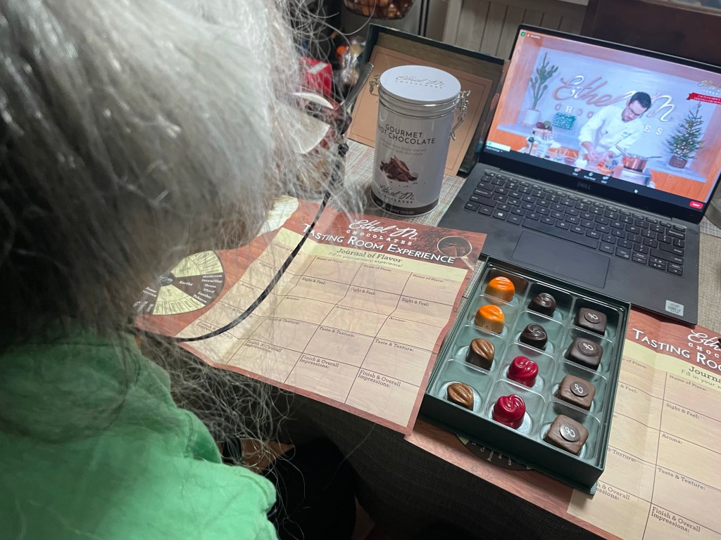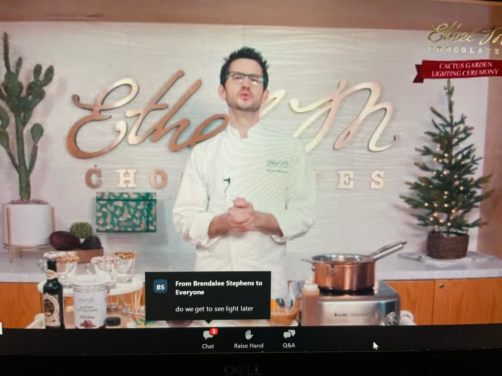 The event kicked off via Zoom with speeches and the Cactus Garden lighting ceremony. Then our Chief Chocolatier did a hot chocolate demonstration focusing on three ways you could up your hot chocolate game. Lastly, it was chocolate time! We sampled a white chocolate peppermint silk piece, milk chocolate pecan pie, a pumpkin spice piece, dark chocolate egg nog, and then milk and dark chocolate fudge pieces. My mom’s favorite was the white chocolate peppermint silk, and mine was the milk chocolate fudge.