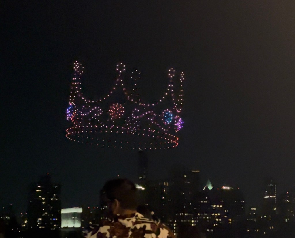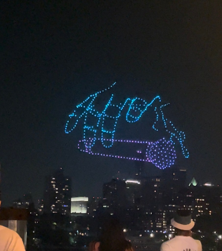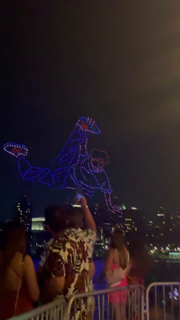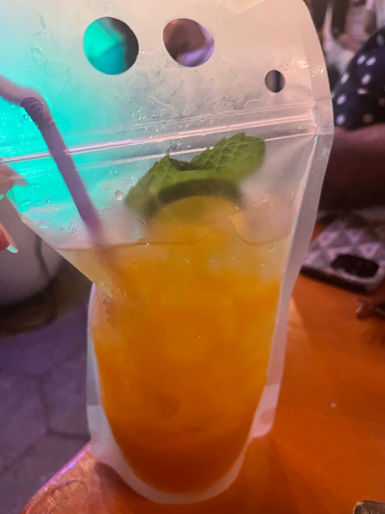 The restaurant was a vibe, with a DJ and a lively crowd. The best part of the night was randomly catching a drone show celebrating Hip Hop. Second best, some drinks came in pouches!