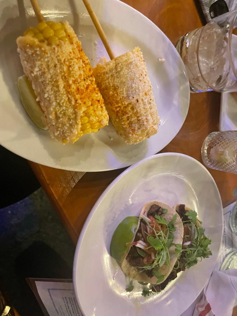 I chose the messiest foods on the menu 🤣, but it was all yummy. I had corn, steak tacos, and a seafood platter with oysters and lobster.