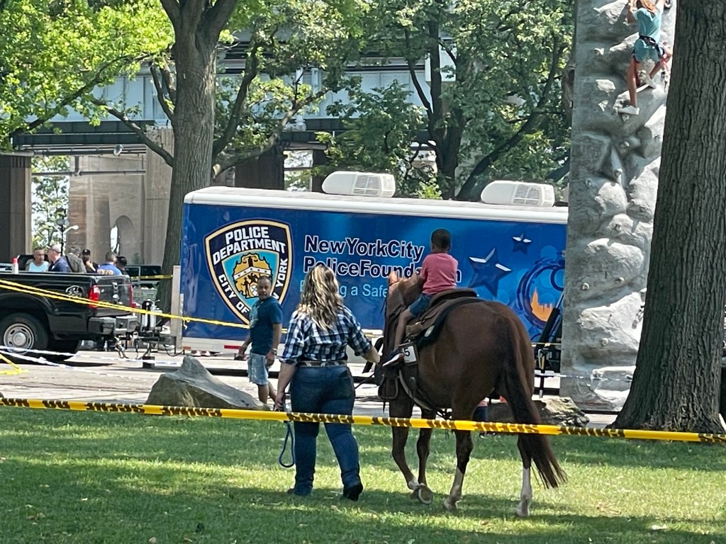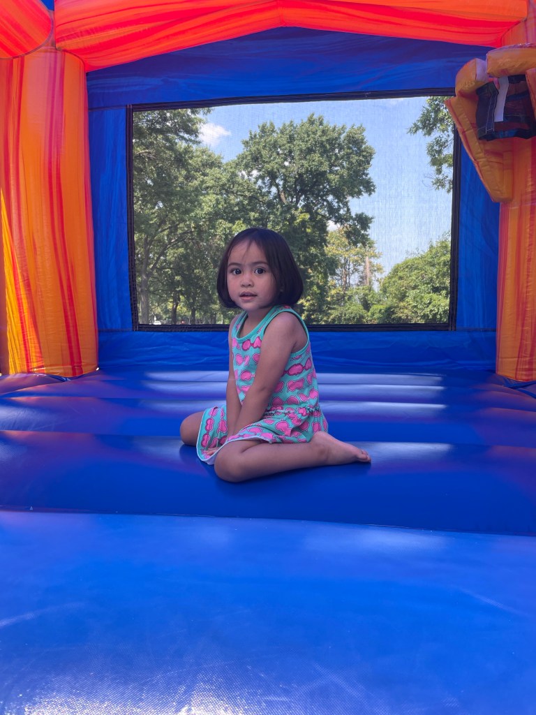 My husband’s job had a family day at Randall’s Island Park this week. They had food, a DJ, bouncy houses, an area where anyone could ride a horse, boat rides, a rock climbing wall, and a gaming station. My daughter Maxine was all about the bouncy houses and the ice cream. We also enjoyed the boat ride, but it was quite a wait. Next year we need to do the boat ride first. Also, I want Maxine to ride one of the horses, and I want to try the rock climbing wall if they do it again.