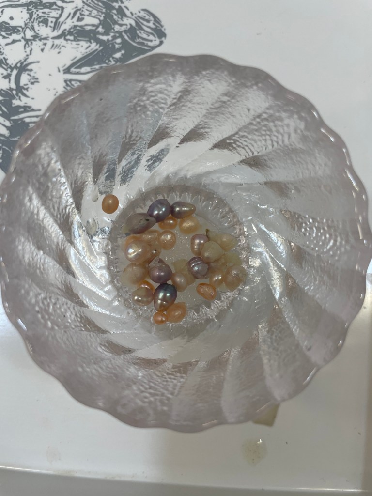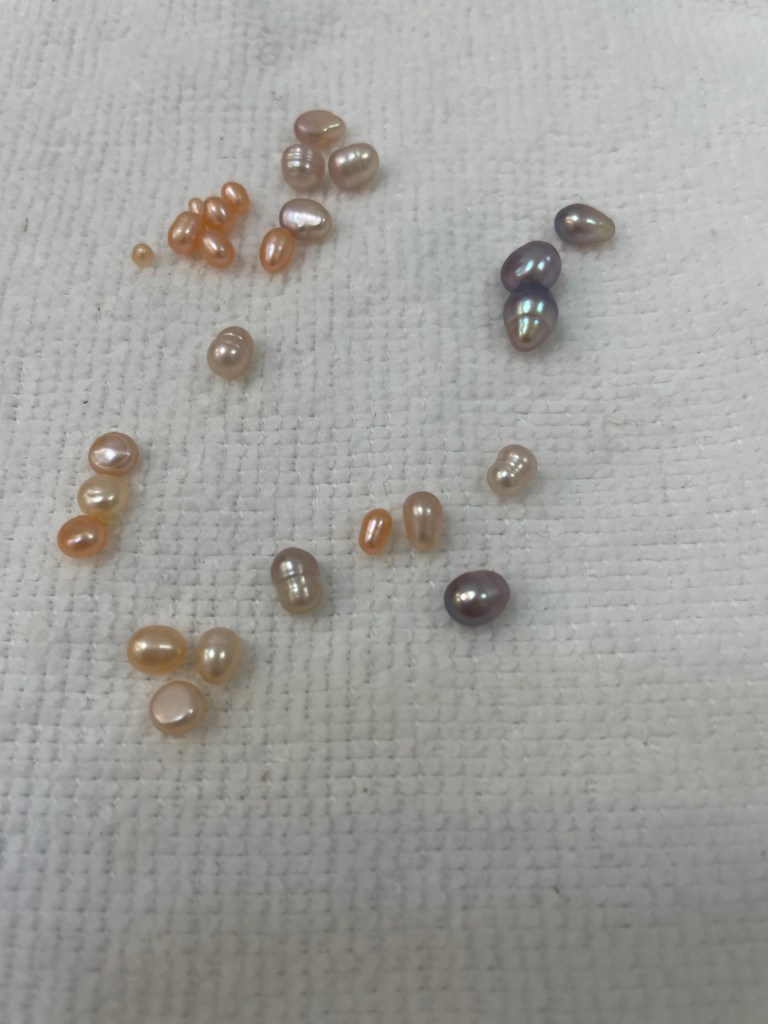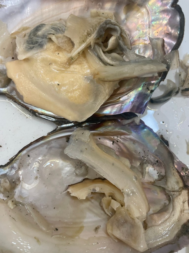 You pick a muscle, open it up, collect the pearls, clean them, and decide what to do with them. I got a good haul of pearls, so I got two rings and two earrings done. They had someone onsite who put together the jewelry. Bonus; I actually got the earrings for free because they were doing a promotion at the time.