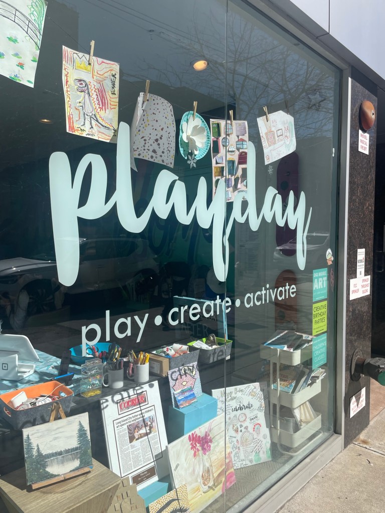 PLAYDAY in Long Island City – heavy on art classes vs playground. We attended a birthday party, but they have so many cool offerings: bookmarking, cartooning, collage creations, fashion design, painting and drawing, and printmaking.